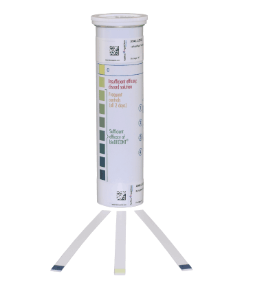 取待測溶液少許,試紙浸入30秒,取出試紙比色,比對結果顯示在“sufficient efficacy”區(qū)間的即為有活性,可以繼續(xù)使用。