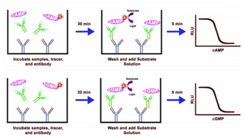 G蛋白是細胞內(nèi)的重要調(diào)控因子,參與細胞運動、代謝和轉錄等生理過程,它通過一系列膜結合受體觸發(fā)細胞內(nèi)的級聯(lián)反應來參與調(diào)節(jié)各種細胞外信號。而調(diào)控G蛋白信號級聯(lián)反應的關鍵是“第二信使”,即環(huán)磷酸腺苷(cAMP)和環(huán)磷酸鳥苷(cGMP)。這兩種分子的關鍵功能之一是激活鳥嘌呤交換因子(GEF),而GEF反過來又在G蛋白的活化中發(fā)揮作用。因此,檢測cAMP / cGMP水平,是研究細胞內(nèi)眾多信號通路必不可少的實驗之一。美國Cell Biolabs公司提供了一種穩(wěn)定、高效的檢測cAMP/cGMP濃度的試劑盒,其采用競爭ELISA的方法,檢測靈敏度可達1 pmol/mL,并且試劑盒特異性強,不與其他第二信使發(fā)生顯著交叉反應,適用于檢測的樣品類型廣泛,包括細胞/組織裂解液、唾液、尿液、血清和細胞上清等。