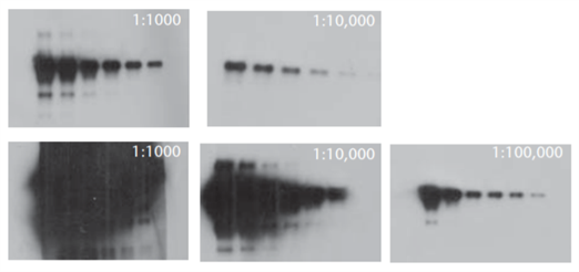 該產(chǎn)品是基于魯米諾開(kāi)發(fā)的一種非同位素的HRP底物,當(dāng)有H2O2存在時(shí),HRP可催化魯米諾發(fā)光,且這個(gè)反應(yīng)相當(dāng)迅速。該底物檢測(cè)信號(hào)與被檢蛋白濃度呈非常好的正相關(guān)關(guān)系,靈敏度高達(dá)pg級(jí)別。此外,反應(yīng)物可從膜上洗去,然后重新加入底物反應(yīng),如此進(jìn)行實(shí)驗(yàn)結(jié)果的優(yōu)化而不再需要重復(fù)全部WB過(guò)程。LumiGLO Reserve是對(duì)LumiGLO的第二代升級(jí)產(chǎn)品,可檢測(cè)pg-fg級(jí)(HRP g/ml)