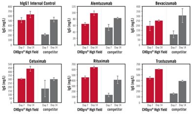 下圖是CHOgro® High Yield Expression System(紅色)與其他品牌CHO細(xì)胞瞬轉(zhuǎn)系統(tǒng)(灰色)在表達(dá)幾個(gè)不同單抗的產(chǎn)量對(duì)比。Mirus CHO細(xì)胞高滴度瞬轉(zhuǎn)表達(dá)系統(tǒng)的蛋白產(chǎn)量與競(jìng)爭(zhēng)品牌相比具有顯著優(yōu)勢(shì)。