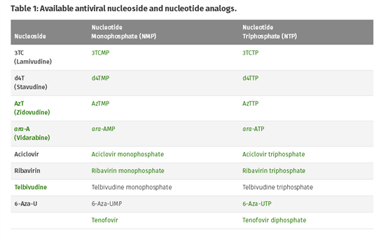 抗病毒核苷/核苷酸類似物可以通過抑制病毒復(fù)制的幾個(gè)關(guān)鍵過程來抑制病毒繁殖,它們通過與天然的dNTP/NTP競(jìng)爭(zhēng)結(jié)合到新的病毒核酸中,從而導(dǎo)致鏈終止或者誘變。在細(xì)胞培養(yǎng)實(shí)驗(yàn)中,可以用抗病毒核苷酸的非磷酸化核苷變體,這種核苷酸在細(xì)胞內(nèi)被多種病毒和/或宿主激酶激活,從而發(fā)揮(tri)磷酸化形式的抗病毒作用。