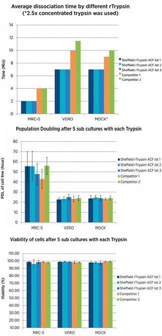 與其他商品化重組胰酶相比,KERRY重組胰酶Sheffield? rTrypsin ACF也表現(xiàn)出了同等甚至更優(yōu)的性能(如下圖所示)。主要表現(xiàn)為用KERRY重組胰酶Sheffield? rTrypsin ACF消化細(xì)胞所需要的時(shí)間更短,消化傳代后細(xì)胞的生長(zhǎng)表現(xiàn)更好,并且批間穩(wěn)定性也非??煽?。
