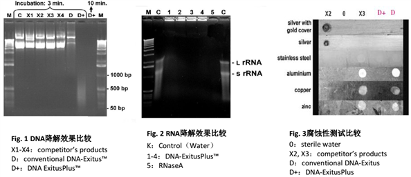 傳統(tǒng)的核酸污染清除多通過修飾、酶解(如DNase)或變性等幾種方式,實(shí)踐證明這些方式存在核酸降解不徹底、試劑具有腐蝕性和毒性等不足。德國AppliChem的DNA-ExitusPlus?(貨號(hào)A7089)是一種無腐蝕、無致癌性的核酸(包括DNA、RNA)清除試劑,該產(chǎn)品可斷裂雙鏈DNA并將其降解,且已降解的核酸片段不能被恢復(fù),從而能徹底消除PCR過程中由于非目標(biāo)DNA導(dǎo)致的假陽性擴(kuò)增。