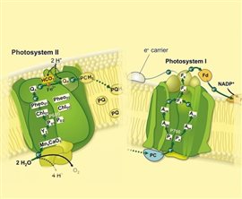 光合作用高效的吸能、傳能、轉(zhuǎn)能過(guò)程是在光合膜上具有一定分子排列空間構(gòu)象的色素蛋白復(fù)合體上進(jìn)行的,并在10-15秒至10-7秒內(nèi)完成。整合于光合膜上的色素蛋白復(fù)合物根據(jù)功能通常分為:光系統(tǒng)I(PSI)、光系統(tǒng)II(PSII)、Cytb6f復(fù)合物以及ATP合成酶復(fù)合物。在這4個(gè)色素蛋白復(fù)合體共同參與下,光合作用的光反應(yīng)完成電子從H2O到NADP+的傳遞并產(chǎn)生ATP和釋放O2。PSI和PSII是生物光能轉(zhuǎn)換的重要場(chǎng)所,涉及水裂解放氧反應(yīng)和原初電荷分離等關(guān)鍵步驟,是決定光合作用效率的重要部位。