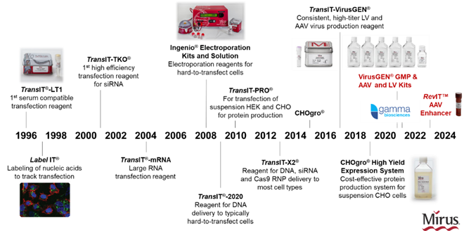 為什么Mirus TransIT-X2® Dynamic Delivery System有著如此高性能及廣泛適應(yīng)性呢?這歸因于Mirus強大且高效的專利遞轉(zhuǎn)平臺設(shè)計,可進行多重、多功能組合的轉(zhuǎn)染試劑組分篩選并優(yōu)化。成立于1995年的Mirus,專注及深耕核酸遞轉(zhuǎn)領(lǐng)域多年(圖1),從最早具有低毒性的TransIT ® -LT1到GMP級別、可用于AAV和LV生產(chǎn)的TransIT-VirusGEN®,都是基于該遞轉(zhuǎn)平臺進行設(shè)計及開發(fā)的。截至目前,使用Mirus產(chǎn)品發(fā)表文章已超過1萬篇,并且發(fā)表文章及Mirus數(shù)據(jù)庫涵蓋了超過1200種細胞類型,更多文章及數(shù)據(jù)查詢,請點擊這里。