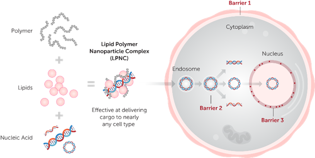 不同于傳統(tǒng)基于單組分的轉(zhuǎn)染試劑(如陽離子聚合物或陽離子脂質(zhì)體),為了進一步提高轉(zhuǎn)染效率,以應(yīng)對不同細胞類型或特定的應(yīng)用。Mirus將專利的多聚物(Polymer)及脂質(zhì)(Lipids)技術(shù)進行多重組合,在不形成脂質(zhì)體復(fù)合物(即liposome,通常具有細胞毒性)前提條件下,得到多種類、高性能的轉(zhuǎn)染方案,克服細胞遞轉(zhuǎn)過程中的多重阻礙,以實現(xiàn)更高效轉(zhuǎn)染和更低的細胞毒性(圖2)。