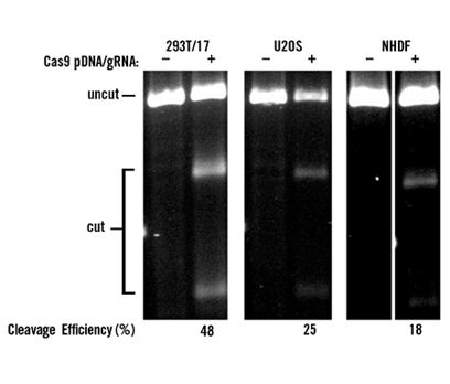 使用TransIT-X2® Dynamic Delivery System (2 μl/孔,24孔板, Mirus Bio)共轉(zhuǎn)染0.5 μg質(zhì)粒DNA(表達Cas9蛋白)及50nM 2-part gRNA (PPIB基因)至HEK293T/17, U2OS 及NHDF細胞中,轉(zhuǎn)染后48小時,T7E1驗證切割效率。