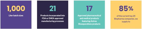英國Astrea Bioseparations于1987年成立,公司前身是Affinity Chromoatography Ltd,其從英國劍橋大學獨立出來專注于吸附填料的研發(fā)和生產(chǎn)。Astrea Bioseparations 公司兩大核心專利技術(shù)(產(chǎn)品)Mimetic ligand® 和PuraBead® 是公司產(chǎn)品的基石,迄今為止已有21個上市產(chǎn)品(FDA/EMA) 使用 Astrea Bioseparations公司的產(chǎn)品用于商業(yè)化生產(chǎn),其中不乏跨國公司和新興生物技術(shù)公司。