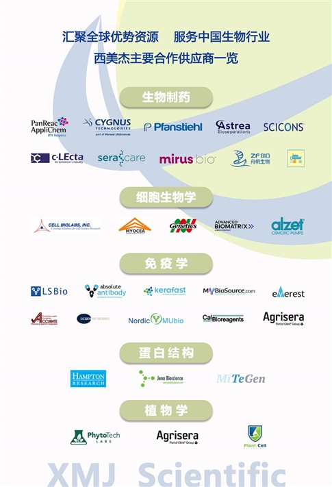 北京西美杰科技有限公司(Beijing XMJ Scientific Co.,Ltd,以下簡稱西美杰)于2006年由留美歸國生物領(lǐng)域?qū)I(yè)人才創(chuàng)辦,是一家集進口試劑銷售、技術(shù)服務(wù)與合約開發(fā)于一體的高科技公司,旨在為生命科學發(fā)展提供一流的產(chǎn)品與服務(wù)。