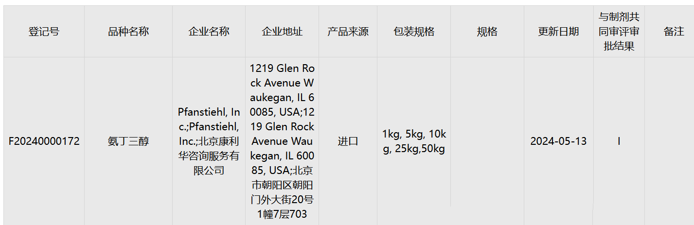 Pfanstiehl 喜獲第15個(gè)CDE登記號- 氨丁三醇Tris Base