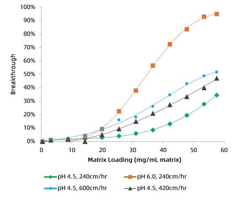 AlbuPure®具有卓越的白蛋白融合蛋白結(jié)合性能,如圖4所示,研究人員在不同pH值不同流速的上樣條件下,探究了AlbuPure®對scFv-rHSA的動態(tài)結(jié)合載量,結(jié)果表明,在pH=4.5,240cm/h線性流速下,AlbuPure®對目標(biāo)融合蛋白的動態(tài)結(jié)合載量最佳,10%流穿時,載量高達(dá)38.4mg/mL。