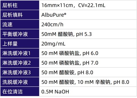 在一項(xiàng)研究測試中,研究人員使用酵母體系表達(dá)Anti-HIV gp41-rHSA融合蛋白(72kDa),收獲液經(jīng)澄清后,上樣到裝有AlbuPure®的層析柱中,層析工藝參數(shù)如下表所示: