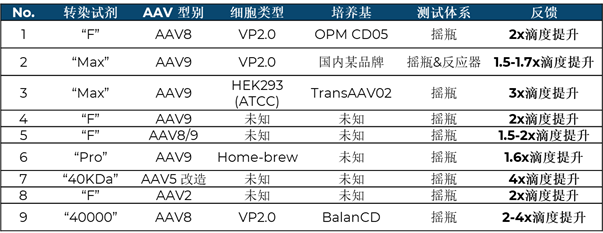Mirus Bio成立于1996年,在核酸遞送領(lǐng)域深耕多年,于2021年8月推出GMP級(jí)別TransIT-VirusGEN® GMP 轉(zhuǎn)染試劑,支持AAV及LV從科研到GMP商業(yè)化生產(chǎn)。不同于傳統(tǒng)基于單組分的轉(zhuǎn)染試劑(如陽離子聚合物聚乙烯亞胺,PEI),Mirus Bio將專利的多聚物及脂質(zhì)技術(shù)進(jìn)行多重組合,形成多功能性的轉(zhuǎn)染方案,克服細(xì)胞遞轉(zhuǎn)過程中的多重阻礙,以實(shí)現(xiàn)更高效轉(zhuǎn)染和更低細(xì)胞毒性,從而大幅度提升多種血清型AAV病毒生產(chǎn)載量。去年7月底Mirus上市RevIT? AAV Enhancer,已證明在不同AAV血清型別中,可提高AAV病毒基因組滴度1.2-4.9倍,并且在一定程度改善了實(shí)心率。更重要的是,RevIT? AAV Enhancer不僅可以搭配Mirus TransIT-VirusGEN® GMP 轉(zhuǎn)染試劑,也適配于其他轉(zhuǎn)染試(如PEI等),使得AAV生產(chǎn)上游成本的進(jìn)一步降低成為可能,進(jìn)而降低了基因治療單劑量成本。下圖展示了國(guó)內(nèi)客戶前期測(cè)試反饋結(jié)果,測(cè)試包括了不同血清型別的質(zhì)粒設(shè)計(jì),適用于國(guó)內(nèi)及國(guó)外品牌的轉(zhuǎn)染試劑、細(xì)胞及培養(yǎng)基體系,實(shí)現(xiàn)了1.5-4倍以上的AAV病毒滴度提升。