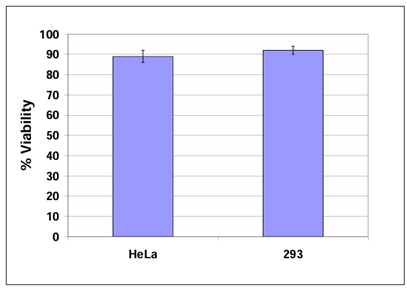 Fig 1?細胞活力檢測:按照實驗方案回收HeLa和293細胞培養(yǎng)6天,用臺盼藍法測定細胞活力。