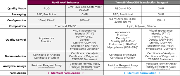 Product Specifications for RevIT AAV Enhancer and TransIT-VirusGEN Transfection Reagent